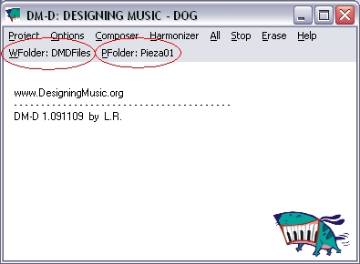 - Pinchando en "Work", y luego en "Project" crearemos nuevas carpetas. Podemos usar cualquier nombre de carpeta, en este ejemplo emplearemos "DMDFiles" para la carpeta de trabajo y "Pieza01" para la de proyecto. Salimos con "Exit", y ahora la ventana del programa incorporará nuestros nombres de carpetas: