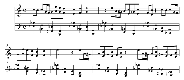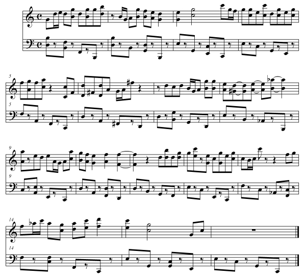 B - Once the Harmony Sheet has been written, it should be exported to XML format, as described in step 1 of this tutorial. The file should be named "inarm.xml" and saved in the DM-D Working Folder. - Now everything is ready to apply the harmonization. We do this with the "Harmonizer" option in the DM-D menu. Once the process has finished, a file named "outar.mid" is generated, containing the harmonized piece. If we open it in the score editor, something similar to this should appear: